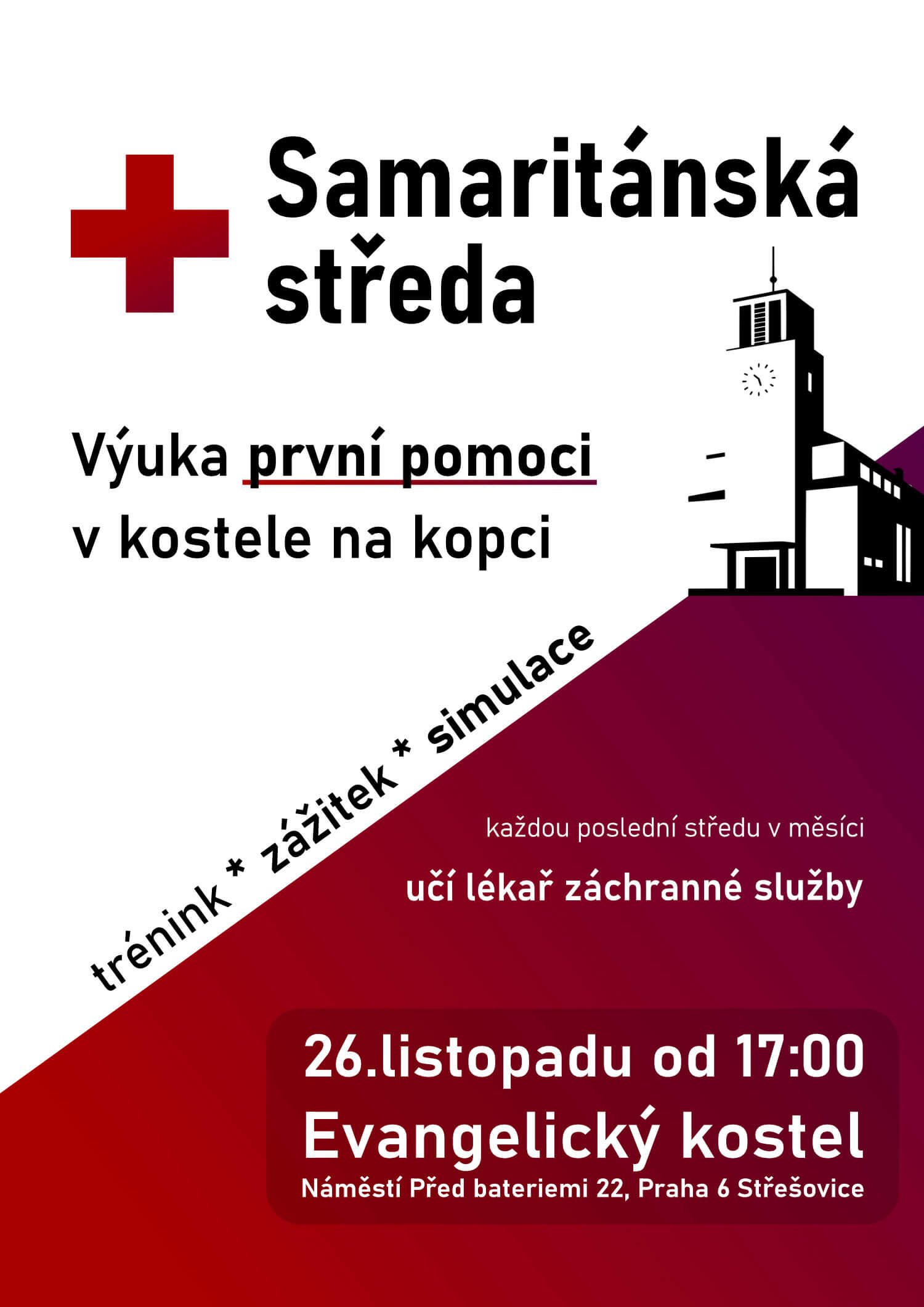 Samaritánská středa Ve středu 26.11. se od 17h uskuteční pravidelná lekce první pomoci pod vedením bratra Roberta Pleskota. David Nadrchal2025-11-23T23:44:01+01:0019.10.2025|Kategorie: Aktuality| Související příspěvky Vyrábění adventních věnců Vyrábění adventních věnců 13.11.2025 Debata s Mikulášem Kroupou Debata s Mikulášem Kroupou 13.11.2025 Válka a mír: střešovická kavárna s Pavlem Rumlem Válka a mír: střešovická kavárna s Pavlem Rumlem 15.10.2025 Povolební debata s Petrem Honzejkem Povolební debata s Petrem Honzejkem 10.10.2025 Biblická hodina – labyrintem Bible Biblická hodina – labyrintem Bible 8.10.2025 Padá kostel, něco si přej Padá kostel, něco si přej 5.10.2025 Restaurant Sunday Restaurant Sunday 8.9.2025 Ekumenické svatodušní setkání Ekumenické svatodušní setkání 28.5.2025 Pozvánka na Noc kostelů Pozvánka na Noc kostelů 12.5.2025 Ekumenická bohoslužba za krajinu Ekumenická bohoslužba za krajinu 12.5.2025 Křížová cesta na Velký pátek Křížová cesta na Velký pátek 13.4.2025 Restaurant Sunday Restaurant Sunday 6.4.2025 Bohoslužby během Velikonoc Bohoslužby během Velikonoc 5.4.2025 Přespávání pro děti a konfirmandy Přespávání pro děti a konfirmandy 10.3.2025 Letní Tábor pro Děti 2025 Letní Tábor pro Děti 2025 10.3.2025